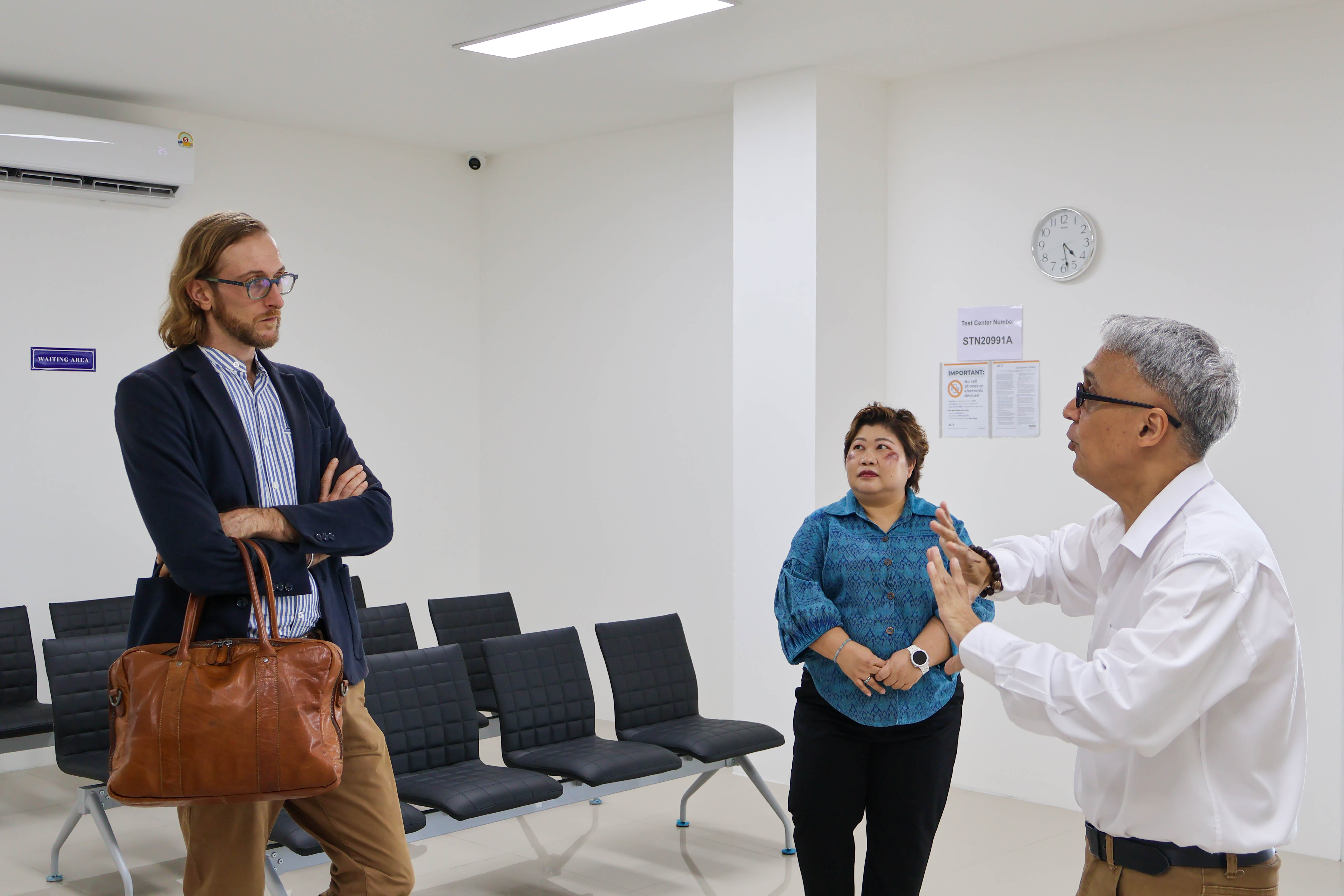 โดยมี ผู้ช่วยศาสตราจารย์ ดร.สุวุฒิ ตุ้มทอง รองอธิการบดี พร้อมด้วยอาจารย์วนิดา วงศ์บรรณาคม ผู้ช่วยอธิการบดี และ อาจารย์นัทธี เพชรบุรี รองคณบดีด้านพัฒนานักศึกษา อาจารย์กันตวีร์ เวียงสิมา ผู้ช่วยคณบดีด้านแนะแนวและศิษย์เก่าสัมพันธ์ พร้อมด้วย อาจารย์คณะศิลปศาสตร์ ศูนย์นนทบุรี ร่วมให้การต้อนรับ การเยี่ยมชมครั้งนี้ถือเป็นก้าวสำคัญในการสร้างเครือข่ายความร่วมมือทางวิชาการระดับนานาชาติ และเป็นโอกาสในการประชาสัมพันธ์ศักยภาพของมหาวิทยาลัยในการพัฒนาศูนย์สอบมาตรฐานสากล เพื่อยกระดับคุณภาพการศึกษาและการทดสอบทางวิชาการให้ก้าวสู่เวทีโลกอย่างยั่งยืน ณ คณะศิลปศาสตร์ มหาวิทยาลัยเทคโนโลยีราชมงคลสุวรรณภูมิ ศูนย์นนทบุรี